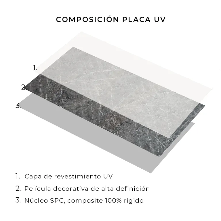 SPC: Composite 100% rígido. Incluye polvo de piedra, resinas y aditivos. Incluye capa de revestimiento UV. Resistente a la humedad, antimoho, antipolillas y eco friendly.